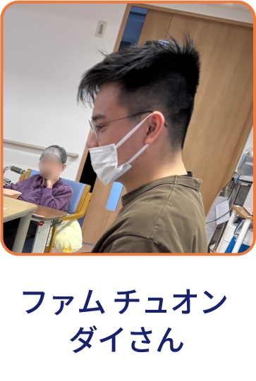 日本の景色や文化をインターネットの写真などで見て日本に興味を持ちました。ベトナムの送り出し機関に行き、日本で働くための話を聞く中で日本の介護の仕事を知りました。その後、日本語センターで日本語と介護について詳しく学び、介護の仕事をやってみたいと思うようになりました。